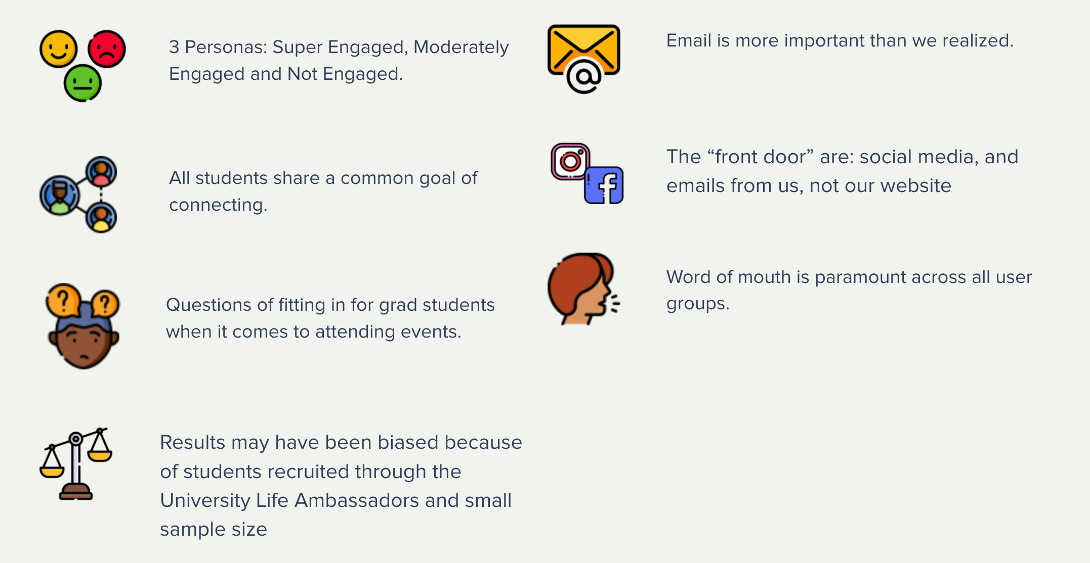 All the students we interviewed shared one common goal — meet and connect with new people. When we asked the students about the probability of attending a University event. Word of mouth was paramount across all user groups.